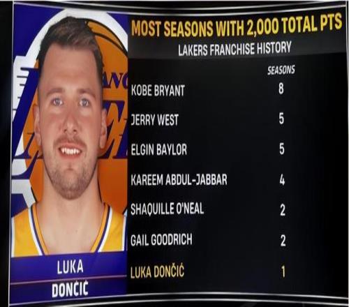 就在今天东契奇在对阵活塞的比赛中,砍下32分7篮板6助攻,数据依旧很亮眼但是最后时刻连续两次错失关键球,导致湖人输给了坎宁安缺席的活塞队,9连胜势头被终结!对于东契奇个人来说,刚刚加盟湖人的首个完整赛季都打出了超级表现,完成了一项詹姆斯8年湖人生涯都没有做到的壮举!此役过后本赛季东契奇总得分来到2005分,成为湖人队史上第七位达成此成就的球员,排在他前面的分别是科比(8次)、杰里·韦斯特(5次)、埃尔金·贝勒(5次)、贾巴尔(4次)、奥尼尔(2次)、古德里奇(2次)!